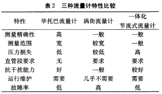 根據(jù)三種流量計(jì)的特點(diǎn),從測(cè)量精確度、測(cè)量范圍、壓力損失、抗干擾能力及運(yùn)行維護(hù)等方面進(jìn)行比較,如表2所示。