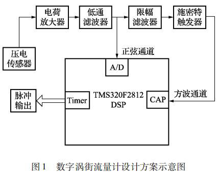 本文設(shè)計(jì)的基于 TMS320F2812 DSP 的數(shù)字飽和蒸汽計(jì)量表的信號(hào)處理系統(tǒng)由前置放大電路和數(shù)字信號(hào)處理電路兩部分組成。本文選用的前置放大電路即為目前被廣泛應(yīng)用的普通飽和蒸汽計(jì)量表的前置放大電路,主要由電荷放大電路、低通濾波電路、限幅濾波電路和施密特觸發(fā)電路組成; 對(duì)于經(jīng)壓電傳感器測(cè)得的渦街信號(hào)采用了頻域分析和時(shí)域分析相結(jié)合的方式,即由前置放大電路和數(shù)字信號(hào)處理電路相配合。時(shí)域分析通道利用 DSP 事件管理器的捕獲模塊,對(duì)前置放大電路輸出的方波進(jìn)行頻率計(jì)算,然后再由 DSP 事件管理器通用定時(shí)器的比較輸出模塊進(jìn)行脈沖輸出。頻域分析通道即 DSP對(duì)低通濾波電路輸出的疊加了許多噪聲的正弦信號(hào)進(jìn)行 A/D 采樣,再利用 DSP 對(duì) A/D 采樣的結(jié)果進(jìn)行頻譜分析,從而得出此時(shí)渦街信號(hào)的頻率,*后由 DSP 通用定時(shí)器的比較輸出模塊進(jìn)行脈沖輸出。系統(tǒng)設(shè)計(jì)方案示意圖如圖 1 所示。