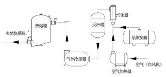 以原料萘為例。萘由原料儲罐經(jīng)液萘泵加壓后進入萘蒸發(fā)器,液萘在萘蒸發(fā)器內(nèi)由中壓蒸汽加熱汽化分離,經(jīng)流量調(diào)節(jié)閥、流量計和氣萘切斷閥后進入汽化器;空氣經(jīng)風(fēng)機加壓后,經(jīng)空氣加熱器加熱后進入汽化器,氣萘和空氣在汽化器內(nèi)混合均勻后進入氧化反應(yīng)器上部,經(jīng)催化床層發(fā)生氧化反應(yīng)生成苯酐和少量的副產(chǎn)物(以順酐、苯甲酸、萘醌、和鄰苯二甲酰亞胺為主);反應(yīng)氣體經(jīng)壓縮空氣計量表冷卻后再進入切換冷凝器進行凝華捕集,少量未被捕集的有機物和不凝氣體經(jīng)尾氣管路進入蓄熱焚燒裝置焚燒處理,焚燒后的尾氣達標排放。