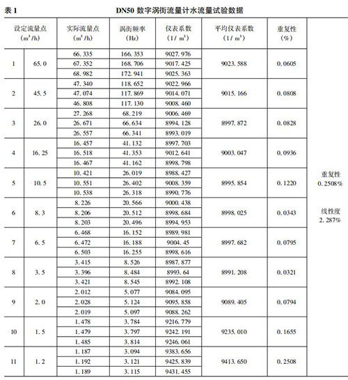將本文實現(xiàn)的數(shù)字管道壓縮空氣流量計在上述 50mm 口 徑( 簡稱 DN50) 的水流量試驗裝置上進行試驗。先在其正常流量范圍內(nèi)進行試驗,流量從大到小逐漸降低,之后不斷探求其所能測量的*小流量。每個流量點試驗三次,計算其重復(fù)性、平均儀表系數(shù)和線性度。水流量試驗數(shù)據(jù)如表 1 所示。