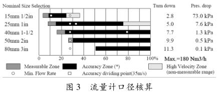 從圖3可見,出流量計口徑為DN80時,*小流量無法測量;流量計口徑縮徑至DN50時,*小流量可測(此時流體的雷諾數(shù)非常接近2×104),但此時的測量精度稍微差些;流量計口徑縮徑至DN40時,*小流量可測,且精度也能得到保證。用上述公式計算的壓損與軟件計算出來的也基本一致,差別來自計算時流速及流量計口徑均采用的是估算值。如果流量計縮徑至DN25時,流量計的壓損已經(jīng)達到7.6kPa,壓損較大,無法滿足工藝要求。因此選擇DN40口徑的流量計能滿足要求。對于DN50口徑的方案,如果流量大于54Nm3/h時,流量計的精度為此款流量計的*佳精度,為1.0%,當流量為50Nm3/h時,此時流量可測,只是精度稍差些,約為1.81%,但流量計的壓損會小很多,從節(jié)能降耗方面考慮,選擇DN50口徑的流量計也是可以的。綜上,選擇DN40和DN50口徑的渦街流量計都能滿足要求。
