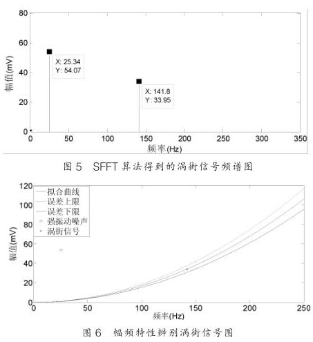 從圖 5 可以看出 SFT 算法能夠很好恢復(fù),對(duì)渦街信號(hào)的頻率恢復(fù)沒(méi)有誤差,而幅值的誤差不超過(guò) 1% ,這對(duì)含有強(qiáng)振動(dòng)噪聲的渦街信號(hào)精確測(cè)量至關(guān)重要;圖 6 是經(jīng) SFT 頻譜分析所得到的數(shù)據(jù)通過(guò)幅頻特性曲線來(lái)辨別是噪聲信號(hào)還是渦街信號(hào)。通過(guò)幅頻關(guān)系的信號(hào)處理方法可以從含有振動(dòng)的混合信號(hào)中識(shí)別渦街信號(hào),從而達(dá)到提高蒸汽管道流量表抗振動(dòng)性能的目的。