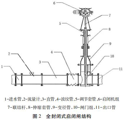 包括進水管、直管、出水管、電廠蒸汽流量計組和啟閉機組,進水管、直管、出水管從左到右依次連接,電廠蒸汽流量計組安裝在直管和出水管之間且位于出水管的入口處,電廠蒸汽流量計組通過聯(lián)結(jié)桿與啟閉機組的輸出端連接。為防止泥沙淤積影響啟閉,電廠蒸汽流量計采用閘板式啟閉結(jié)構(gòu)。密封式啟閉閘為整體封閉管道式,全部采用不銹鋼材料,水流通過管道流出讓整個閘井內(nèi)干燥無水。伸縮套管與波紋管的設(shè)計讓檢修與清理淤泥更加方便。電廠蒸汽流量計裝有荷載限制器,其布置受力明確、結(jié)構(gòu)緊湊、動作可靠。當?shù)蹙呱系暮奢d達到額定值的 110%時,或電機電流超過額定電流 150%時,系統(tǒng)自動切斷操作電源以保護設(shè)備安全。