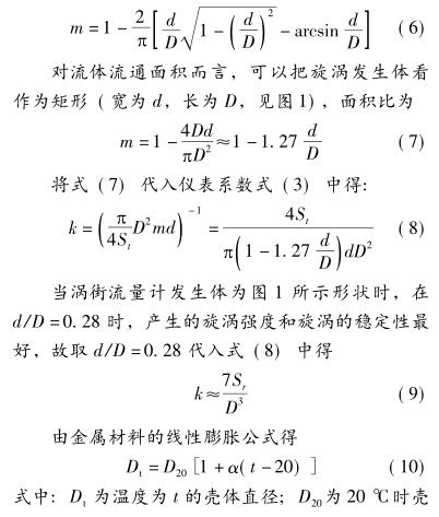 為發(fā)生體兩側(cè)的平均流速,m/s; d 為發(fā)生體迎流面的寬度,m; v 為管道平均流速,m/s; m 為旋渦發(fā)生體兩側(cè)弓形面積與管道橫截面面積之比。