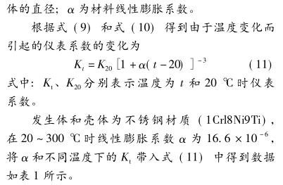 由此計算分析可以看出,隨著介質(zhì)溫度升高或降低,蒸汽流量計機械結(jié)構(gòu)因熱脹冷縮 ( D、m、d) 尺寸發(fā)生變化,引起儀表系數(shù) K t 隨之變化,因此,蒸汽流量計使用時一定要重視 “工況狀態(tài)下的溫度設(shè)定”這個參數(shù)設(shè)置,設(shè)定溫度越接近測量介質(zhì)的溫度,測量誤差越小。