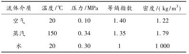 實驗條件下空氣、蒸汽、水為測試流體介質(zhì)時,各測試條件參數(shù)如表 2 所示。