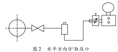 從圖中不難理解,冷凝罐中多余的冷凝水沿著斜坡流回母管,但是在實(shí)際現(xiàn)場中經(jīng)常選用的一次閥是針型閥,如果選用公稱通經(jīng)太小的話,使凝結(jié)水回流不暢而積在針型閥上方的引壓管內(nèi),引起引壓管密度不一致。測量蒸汽時母管與冷凝罐進(jìn)行汽液交換包括兩部分,一是母管內(nèi)的蒸汽經(jīng)一次閥進(jìn)入冷凝罐,二是冷凝罐內(nèi)的液體返回母管。在汽液交換時如果正負(fù)壓管是完全同步,交換的方向也完全一致,孔板取壓口的差壓轉(zhuǎn)換成凝結(jié)水的差壓,并不會產(chǎn)生差壓值的變化,但是實(shí)際上很難保證這種交換既同步又同向。這樣在蒸汽量小的時候,2個引壓管的密度之差乘以sin45°就會有一差值,這個差值通過一系列的計算會傳遞到變送器的差壓值,就會存在不計或者計量偏大的現(xiàn)象。如何解決上述問題,建議按照圖2安裝,水平方向取壓,盡管2個引壓管的密度還是有差異,由于θ=0°即sin0°=0,就不會存在差異值。但是還會存在示值波動,要解決示值波動的問題,建議將針型閥換成閘閥或者球閥,要求內(nèi)徑不小于10mm,一次閥門的公稱通經(jīng)也要不小于10mm。