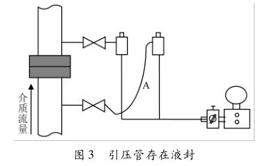 在用孔板測量蒸汽流量時,通常要安裝2個冷凝罐,2個冷凝罐內(nèi)液位高度相等是差壓信號不失真?zhèn)鬟f的關(guān)鍵。這2個冷凝罐必須同高度安裝,底部是出口接變送器,冷凝罐的側(cè)面是入口接孔板側(cè),按照圖2取壓。其作用有2個:一是將蒸汽差壓信號轉(zhuǎn)換成凝結(jié)水的差壓信號,以防蒸汽直接進(jìn)入差壓變送器高低壓室,燙壞儀表;二是保證引壓管兩側(cè)冷凝液位相同,起到平衡作用,冷凝罐截面積相對于引壓管截面來說要大很多,有利于維持冷凝水液位的相對穩(wěn)定。