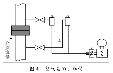 如圖3所示,取壓口和冷凝罐之間存在液封,A段管在一次閥附近形成U形水封,所以這段管的凝結(jié)水無法靠重力順暢地返回母管。A管內(nèi)的凝結(jié)水,由于流體靜力學(xué)的作用,對正在冷凝罐內(nèi)的靜壓產(chǎn)生抽吸作用,從而使差壓產(chǎn)生偏移。必須對引壓管進(jìn)行整改,如圖4所示,引壓管彎曲的弧度標(biāo)準(zhǔn)為90°,嚴(yán)格按照要求作業(yè),消除由于安裝導(dǎo)致的誤差。