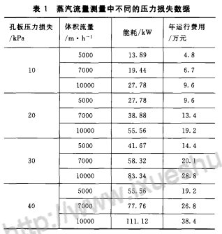 表1的數(shù)據(jù)為蒸氣流量測(cè)量中不同的壓力損失,孔板流量計(jì)引起的額外耗電量、電耗費(fèi)用、其中運(yùn)行天數(shù)按360d計(jì)算,電價(jià)按0.4元/kW·h計(jì)算,