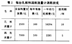 由表2可知,渦街流量計的壽命較低而設備購置和維修費又偏高。但因動力耗損費大大低于孔板流量計,其節(jié)約潛力仍相當可觀。