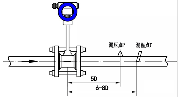 注:測(cè)壓孔和測(cè)溫孔的安裝設(shè)計(jì)。被測(cè)管道需要安裝溫度和壓力變送器時(shí),測(cè)壓孔應(yīng)設(shè)置在下游3-5D處,測(cè)溫孔應(yīng)設(shè)置在下游6-8D處。