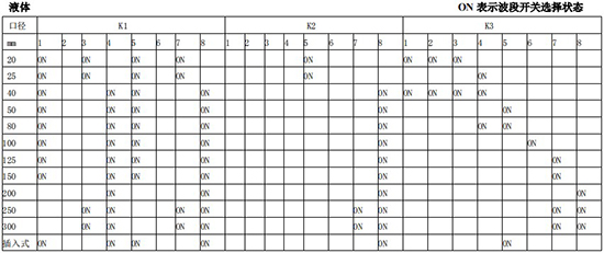 以上表值僅供參考,實(shí)際使用中因液體粘度和氣體密度不同應(yīng)在此值附近調(diào)整,頻率低時(shí)可將 K3 向大口徑方向調(diào)一至三檔。頻率高時(shí)可將 K2 向小口徑方向調(diào)一至三檔。