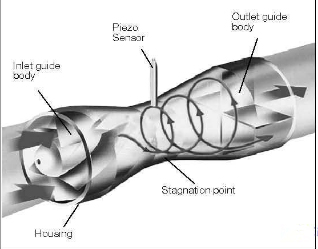 上圖可以看出旋進(jìn)漩渦流體是整體旋轉(zhuǎn),渦街是流體局部產(chǎn)生漩渦。這兩種流量計(jì)的測(cè)量原理都是通過(guò)漩渦頻率與流速的關(guān)系,測(cè)出流量的!