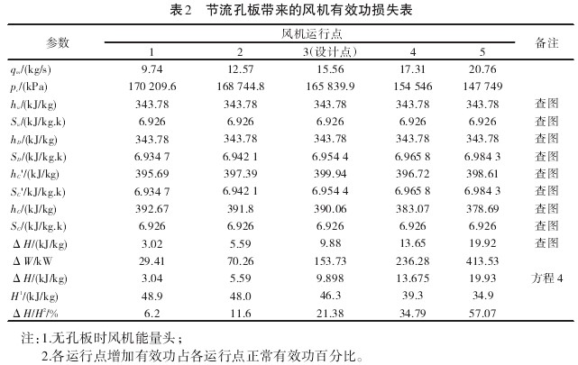 結(jié)合工程實例,對不同進(jìn)口流量時孔板節(jié)流后壓力、溫度、熵增分析,計算節(jié)流孔板引起風(fēng)機不同運行點的進(jìn)口壓力和風(fēng)機消耗有效功的增加,得到如下結(jié)論: