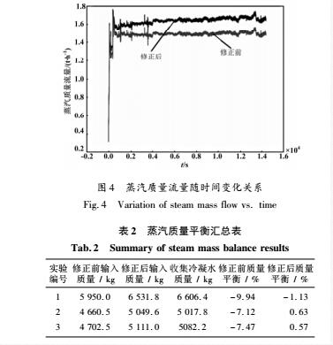 對(duì)圖4中蒸汽質(zhì)量流量數(shù)值進(jìn)行時(shí)間積分,可獲得對(duì)應(yīng)條件下的蒸汽輸入總質(zhì)量。實(shí)驗(yàn)完成,冷卻后通過實(shí)驗(yàn)殼下端收集稱重裝置稱量獲得輸出的冷凝水的總質(zhì)量,通過對(duì)比兩者差異來評(píng)價(jià)修正前后質(zhì)量流量計(jì)測量的精度。結(jié)果如表2所示,實(shí)驗(yàn)編號(hào)1為圖4中所示質(zhì)量結(jié)果統(tǒng)計(jì),編號(hào)2和3為另外兩次測試結(jié)果。質(zhì)量平衡結(jié)果表明,修正之后的質(zhì)量流量計(jì)公式可以明顯提高測量精度。