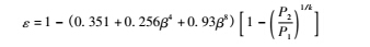 膨脹系數(shù)是對(duì)流出系數(shù)在可壓縮性流體中密度變化的修正。對(duì)于孔板流量計(jì),由于流量計(jì)膨脹既是軸向的又是徑向的,目前主要按照經(jīng)驗(yàn)公式計(jì)算。按照ISO5167,孔板的三種取壓方式采用同一可膨脹性系數(shù)公式,適用于空氣、蒸汽及天然氣等介質(zhì),如下式所示。