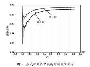 通過實(shí)驗(yàn)獲得蒸汽流動(dòng)過程中測得的各項(xiàng)參數(shù),并使用通用公式及修正后的公式進(jìn)行相應(yīng)計(jì)算處理,獲得所需數(shù)據(jù)。如圖3所示為修正前后膨脹性系數(shù)**間變化的關(guān)系。