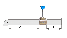 若傳感器安裝點的上游有90°彎并沒有或T形接頭,傳感器上游應(yīng)有不小于20D的等徑直管段,下游應(yīng)有不小于5D的等徑直管段。