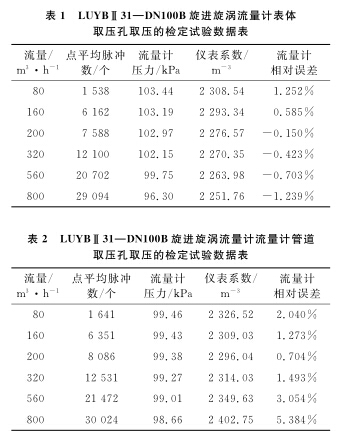 以使用廣泛的DN100B甲烷計(jì)量表為例,系統(tǒng)運(yùn)行時(shí)間為60s,標(biāo)準(zhǔn)裝置的滯止平均溫度為28.9℃,空間平均濕度為30%,流量計(jì)的平均溫度為28.3℃,在表體取壓孔取壓和管道取壓孔取壓的流量計(jì)檢定試驗(yàn)數(shù)據(jù)分別如表1、2所示。